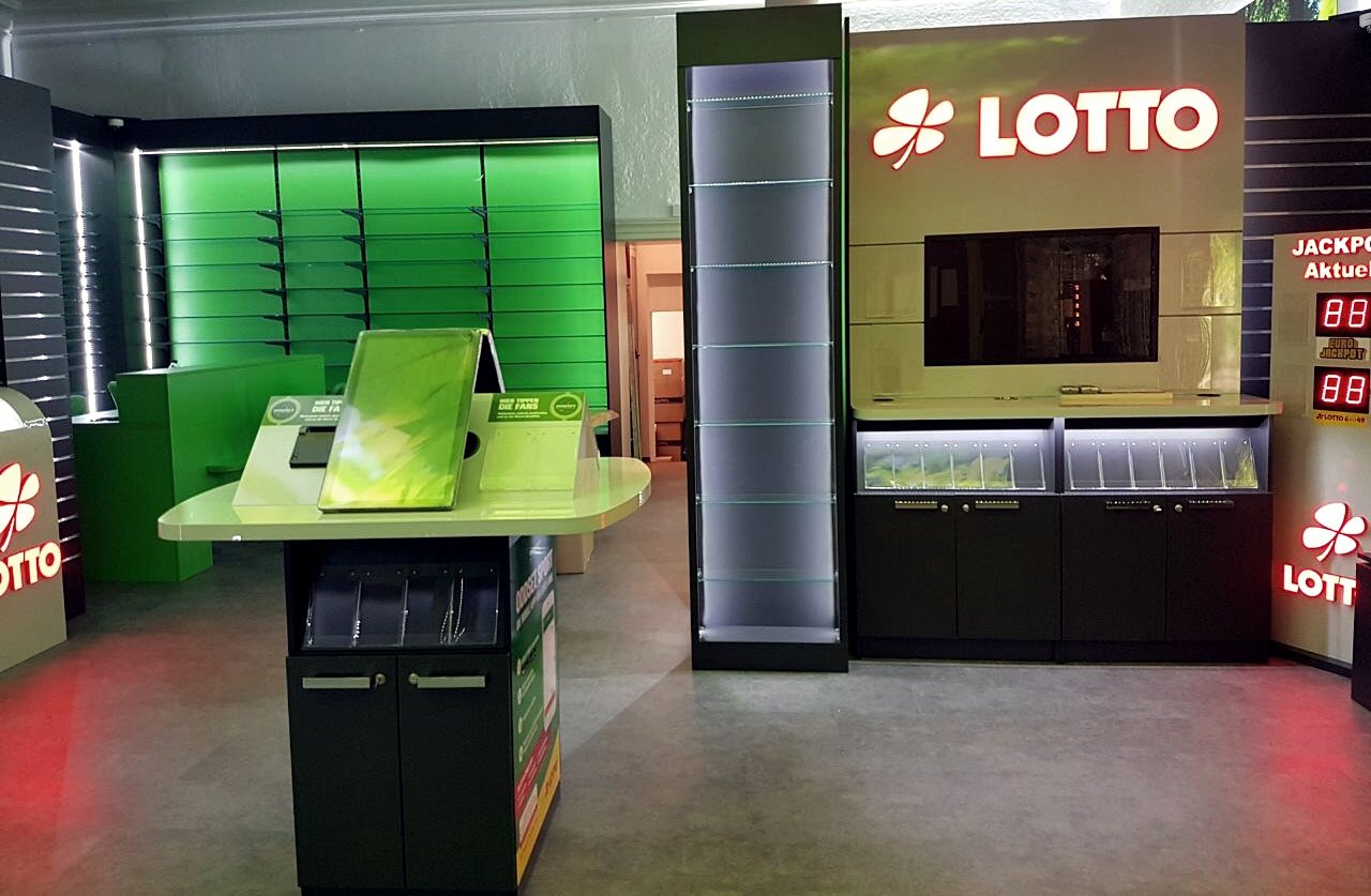 Hier zu sehen: die neue Lotto Sachsen – Anhalt Jackpot Stele, Lotto – Schreibwand mit Monitor, Spielscheindisplays und abschließbaren Unterschränken.