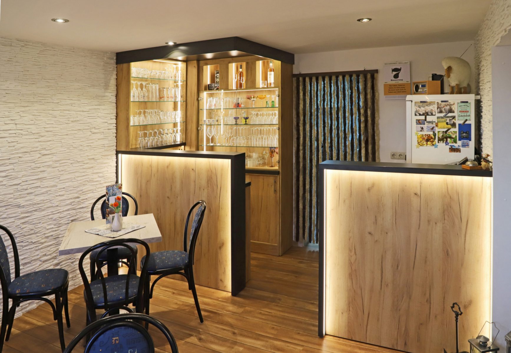 Linke Seite Bar mit Rückbuffet, rechte Seite Kassentresen